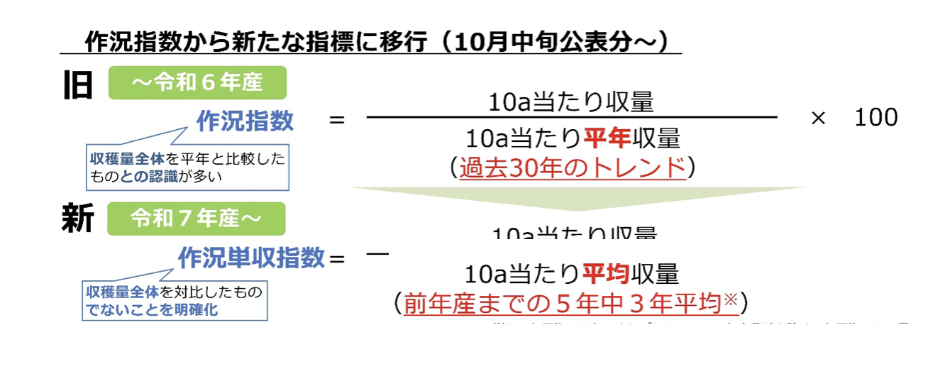 農林水産省は、作況指数に代わる新たな指標として「作況単収指数」を10月中旬から公表することとしています。